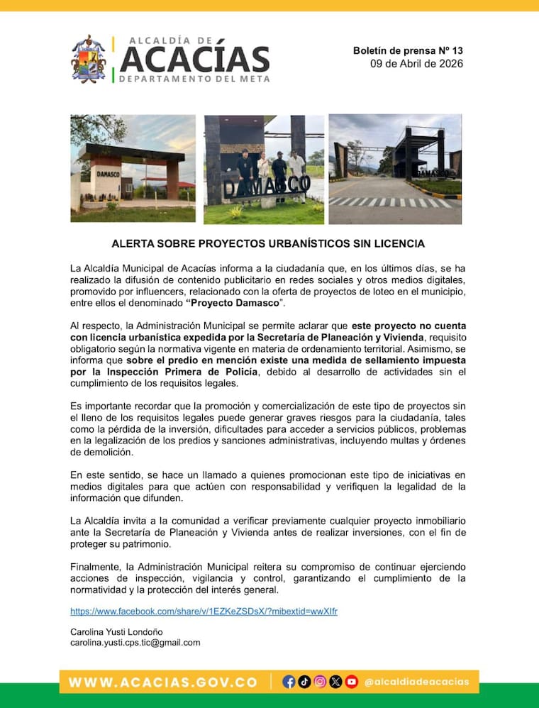 La Alcaldía de Acacías, en el departamento del Meta, se pronunció a través de un comunicado en el que alerta a la comunidad sobre las inconsistencias legales relacionadas con el llamado ‘Proyecto Damasco’.