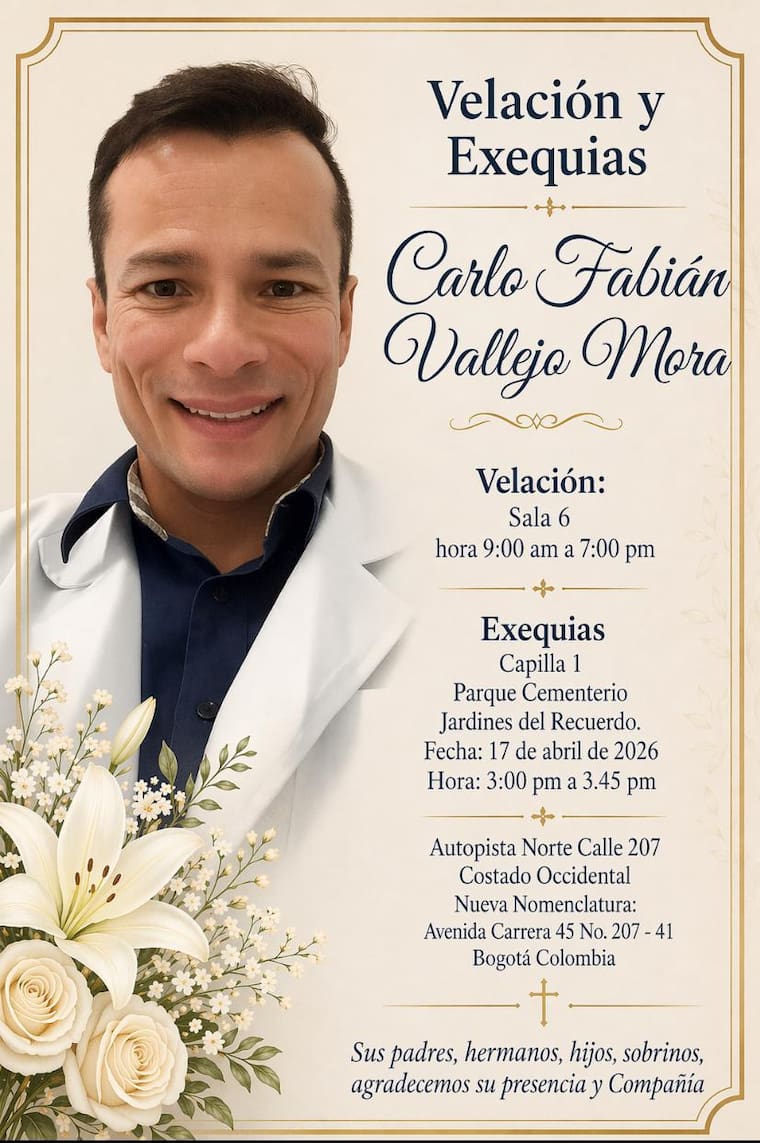 Su cuerpo es velado en la sala 6 del Parque Cementerio Jardínes del Recuerdo, ubicado en la Autopista Norte con Calle 207, en Bogotá, y las exequias se cumplirán en la capilla 1 este viernes 17 de abril de 3:00 p.m. a 3:45 p.m.