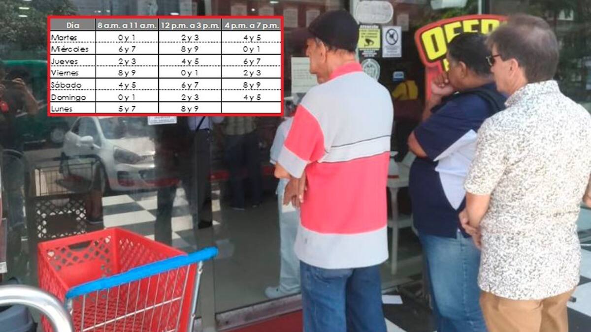 Los sábados: de 8 de la mañana a 11 de la mañana, podrán comprar las personas cuyas cédulas terminen en 4 y 5; de 12 del mediodía a 3 de la tarde, las cédulas terminadas en 6 y 7 y de 4 de la tarde a 7 de la noche, las cédulas terminadas en 8 y 9.