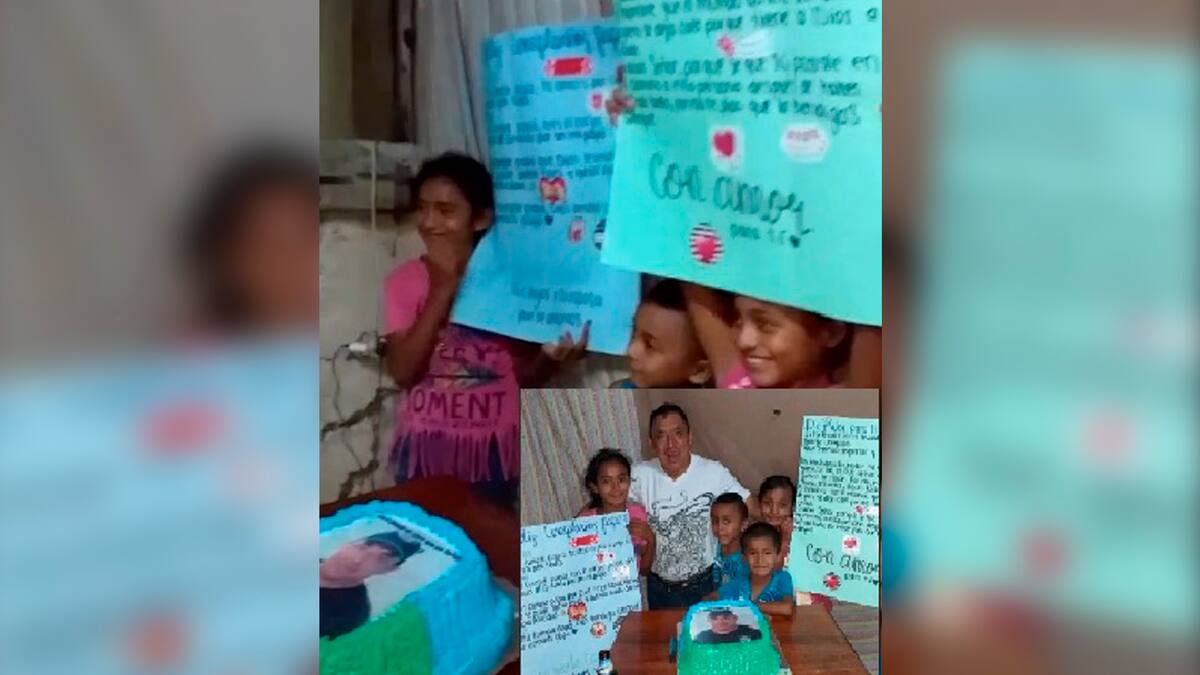 El padre de los pequeños al quitarse el vendaje y ver la sorpresa de sus pequeños y su esposa, no pudo ocultar su felicidad en medio del llanto de la misma emoción, al ver una torta de cumpleaños por primera vez en su vida.