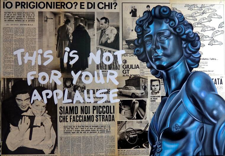 Isabella escogió específicamente para esta serie estatuas renacentistas. Cada una tiene su historia, pero ella le agregó elemento de crítica con textos en color blanco, que son casi como un meme.