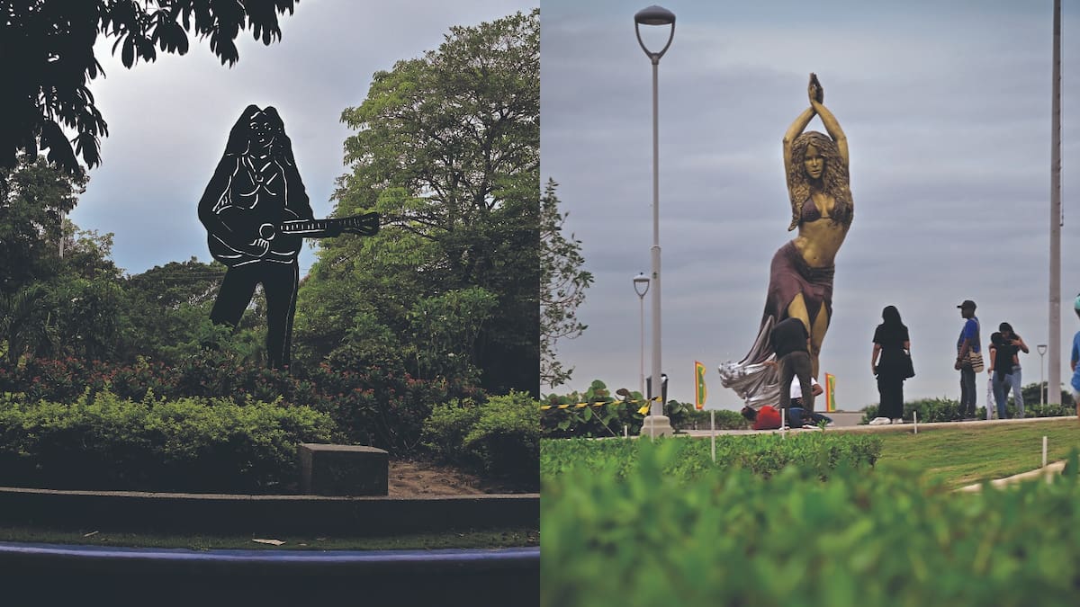 Desde 2006, una figura icónica de la ciudad posa en todo su esplendor con la imponente vista del recinto deportivo más importante de Barranquilla. Shakira Isabel Mebarak Ripoll sostiene una guitarra luciendo su característico cabello largo.