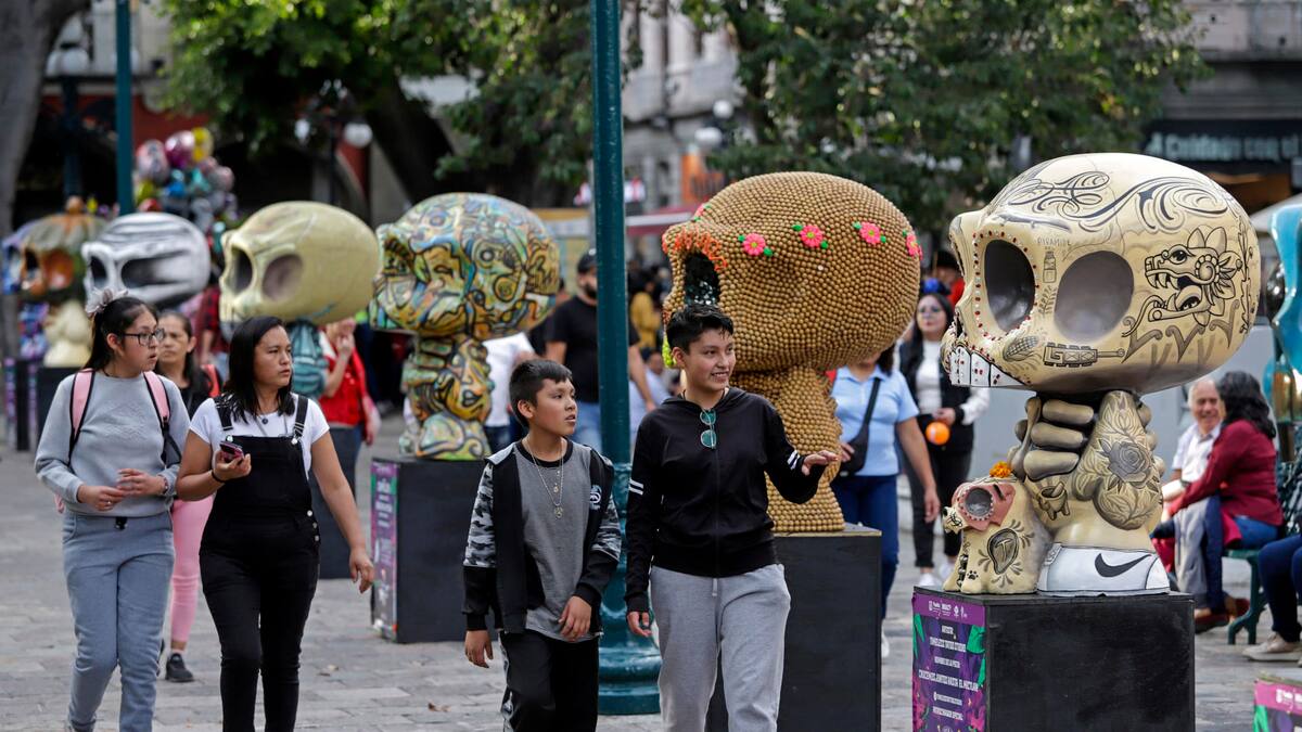 Las calaveras se han esparcido en las plazas públicas de Puebla, en el centro del país, donde estas figuras representan a las creaturas místicas de los alebrijes, actores, mariachis, celebridades, entre otros personajes históricos.