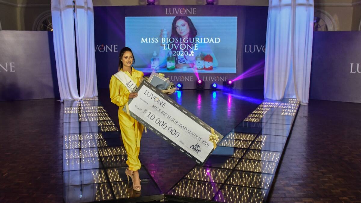 En primera instancia, las reinas se robaron los aplausos del selecto público con una pasarela. Las 31 candidatas modelaron los productos de bioseguridad, como el alcohol en aerosol y los tapabocas patrocinados por la marca Luvone.