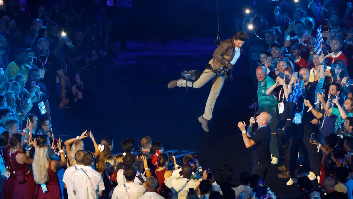 El famoso actor Tom Cruise, especializado en películas de acción y aventuras como la saga Misión Imposible y Top Gun, descendió de los cielos para recibir la bandera olímpica. saludó a la alcaldesa de Los Ángeles y a la gimnasta Simone Biles, antes de tomar la bandera.
