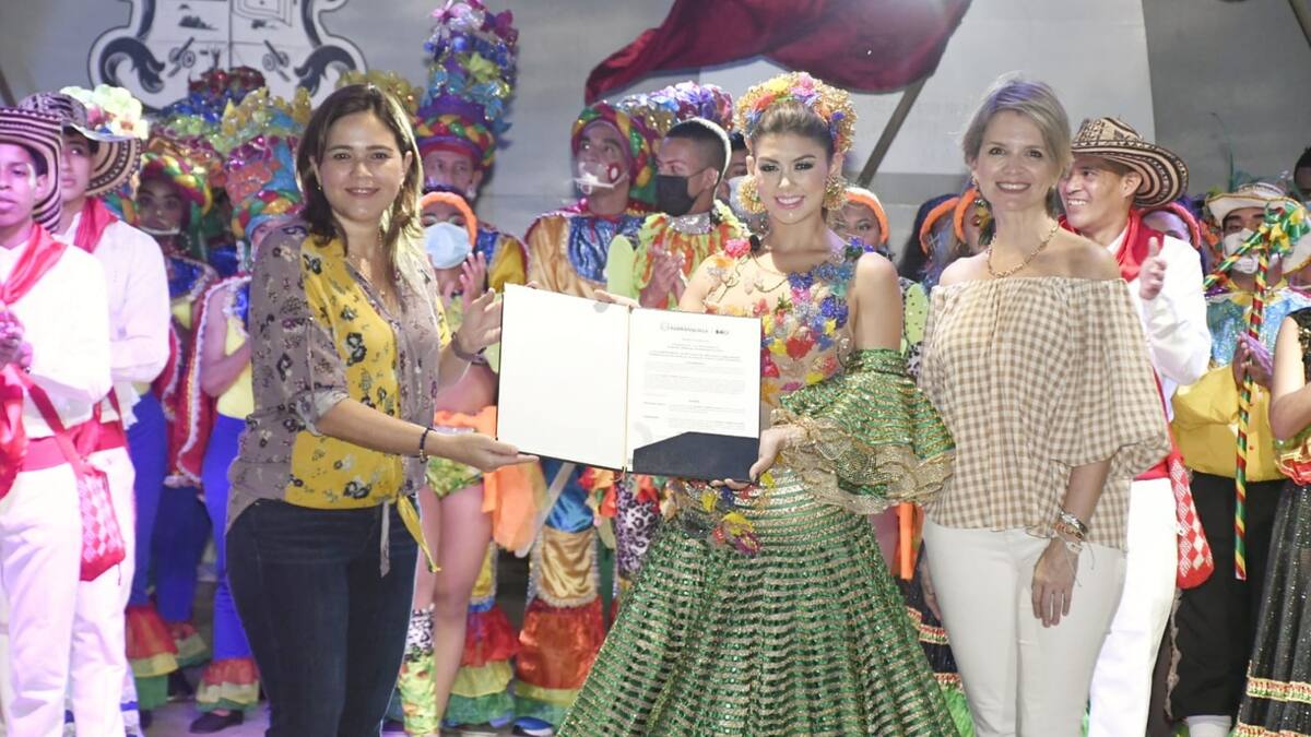 De inmediato, la reina Valeria Charris, en compañía de la gerente de Carnaval de Barranquilla S.A.S., Sandra Gómez, recibió en el escenario el decreto 0254 de 2021 que la designa como reina de la fiesta.