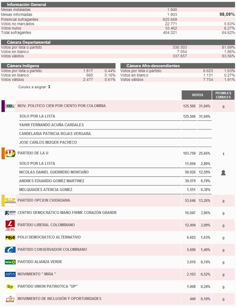 Nicolás Daniel Guerrero Montaño (Partido de la U) 50.926 votos.