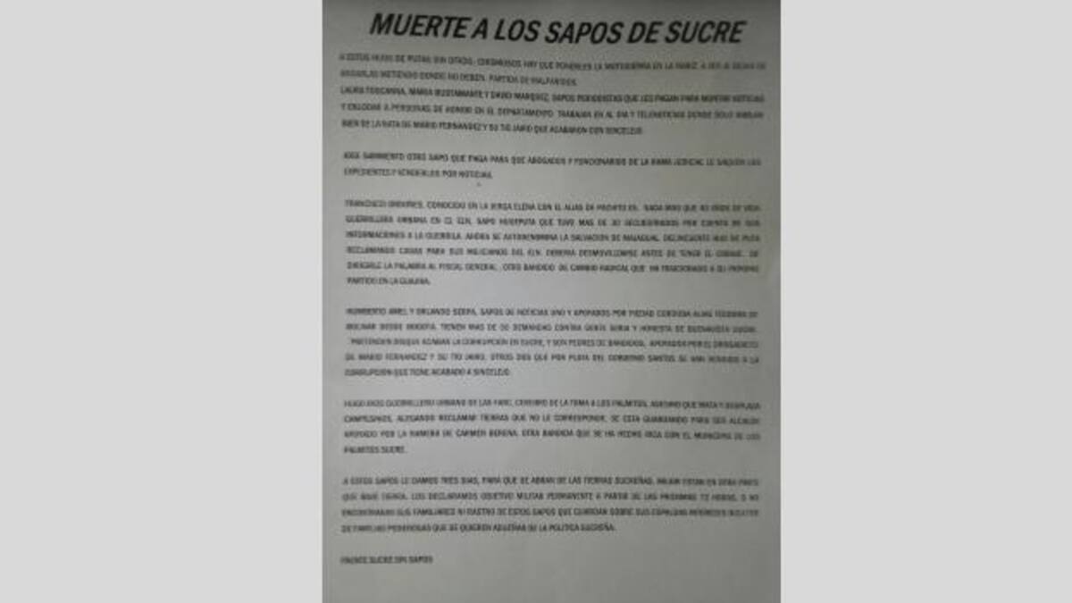 El pasquín es firmado por el frente Sucre sin sapos y ya está en poder de la Policía Nacional que investiga la procedencia y autoría del mismo.