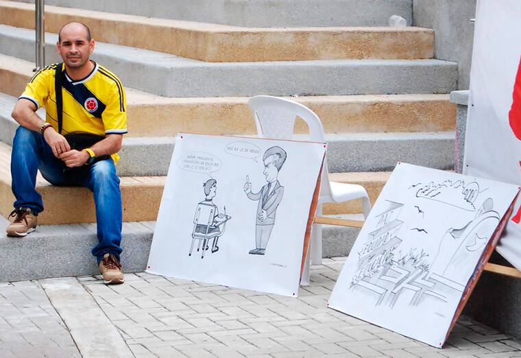 Una de las expresiones que más llamó la atención fue la del docente José Gregorio Santander Mora, licenciado en Matemáticas, quien presentó dos caricaturas que expresan fuertes críticas a Juan Manuel Santos.