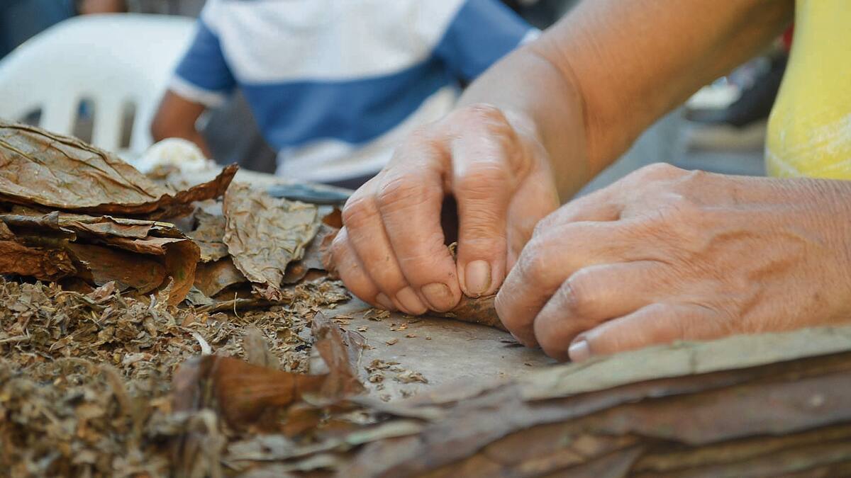 Saca una hoja arrugada de la planta de tabaco que usará como capa. Luce tan curtida como su piel trajinada por el sol y los años. La plancha con las manos y le tira el jamiche encima. La envuelve en un movimiento sincronizado y todo el proceso lo sella con el almidón que unta en una de las puntas del elemento tubular. Observarla es presenciar un ritual ambientado con una gaita que parece que llora en el fondo.