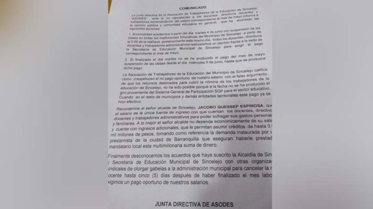 Dijo que al término del martes 'no se ha producido el pago de mayo habrá suspensión de clases desde el miércoles 5 de junio e irá hasta el día que nos paguen', dijo, al tiempo que califica esta situación de irrespetuosa y considera falaz el argumento de que los recursos destinados para cubrir la nómina de los trabajadores de la educación de Sincelejo no estuvieran disponibles porque no se ha producido el giro proveniente del Sistema General de Participación para el sector educativo cuando en el resto de municipios y demás entidades territoriales este pago ya se hizo efectivo.
