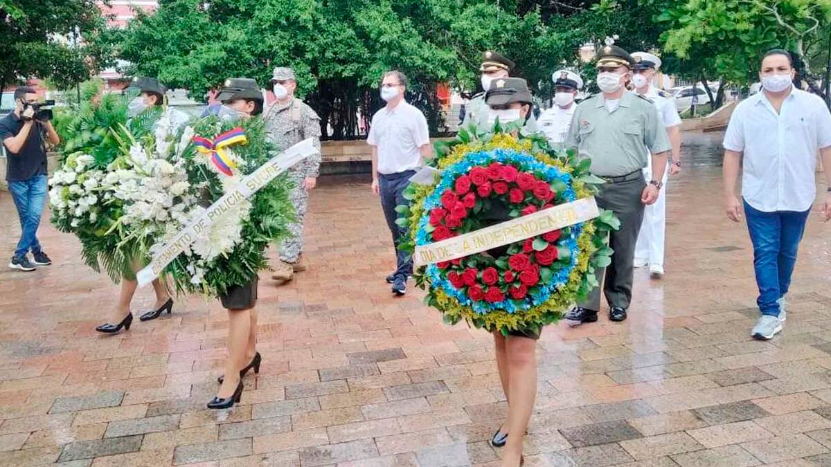 Al pie de la estatua de Francisco de Paula Santander, en el parque central de Sincelejo que lleva el mismo nombre, los uniformados y el alcalde Andrés Gómez Martínez, colocaron una ofrenda floral que en esta oportunidad es en honor a los héroes del país, a esos que hoy batallan contra la pandemia de la COVID-19 y de manera especial a quienes han perdido la vida en cumplimiento de la misión de salvar la de otros.