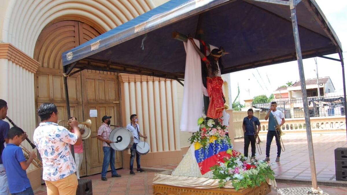 A puerta cerrada, pero con la réplica de la imagen en las afueras de la Basílica Menor del municipio de San Benito se cumplió la misa que fue presidida por el párroco Walton Pineda y transmitida por redes sociales.