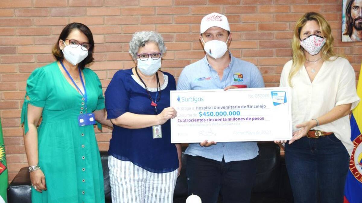 Lucía Fadúl, gerente de Surtigas en Sucre, fue la encargada de entregar el cheque en un acto que tuvo lugar en la Gobernación de Sucre y en el que además del mandatario estuvieron presentes la secretaria de salud departamental Patricia Chica y la agente interventora del HUS, Inés Loaiza Guerra, además del gerente general de Surtigas, Santiago Mejía, quien intervino de manera virtual.