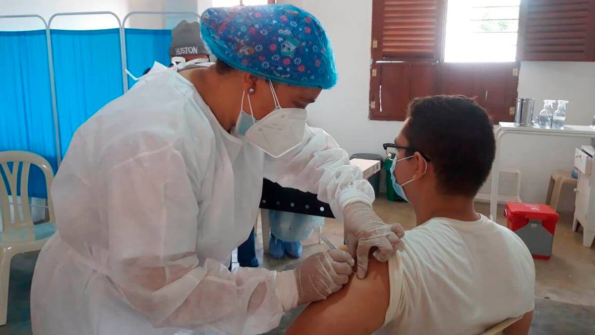 Juan Camilo Pineda De la Ossa, un sinceano de 25 años que reside en el barrio Palacio, fue el primer vacunado en el puesto de la Institución Educativa Antonia Santos, uno de los 7 habilitados en la cabecera