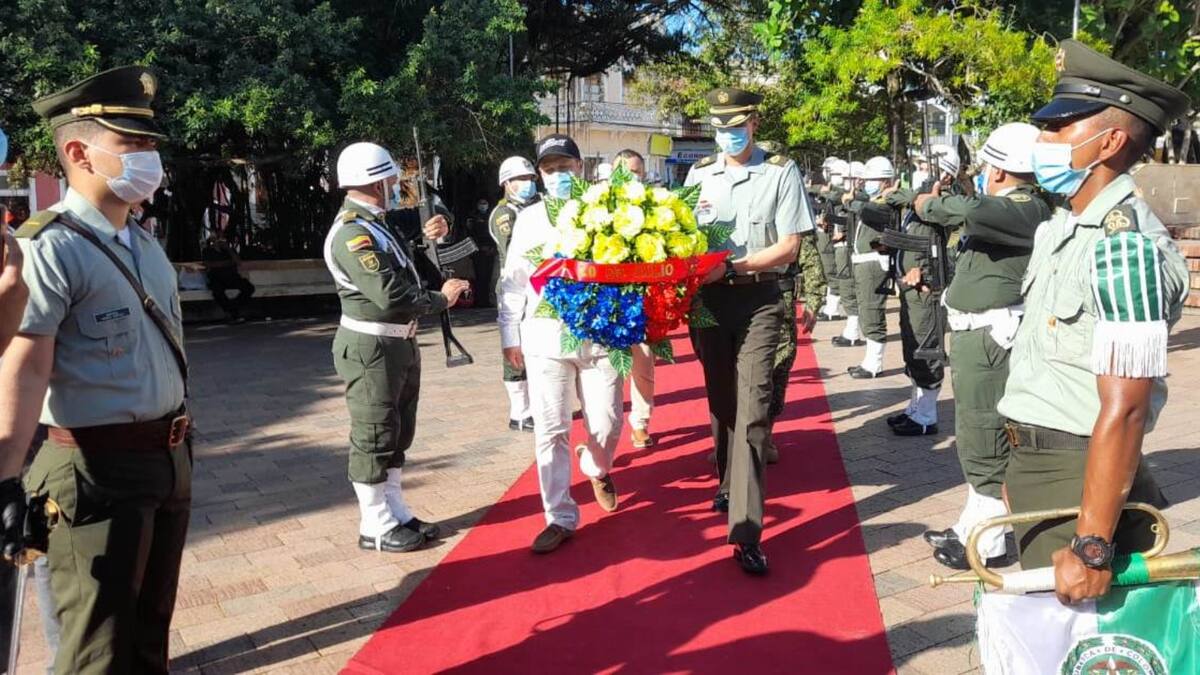 El gobernador Héctor Olimpo Espinosa Oliver y el comandante de la Policía en Sucre, coronel Ricardo Sánchez Silvestre, fueron los encargados de llevar la ofrenda floral a Francisco de Paula Santander, el militar y político colombiano que se hizo célebre por su participación en el proceso de independencia que hoy celebra el pueblo colombiano.