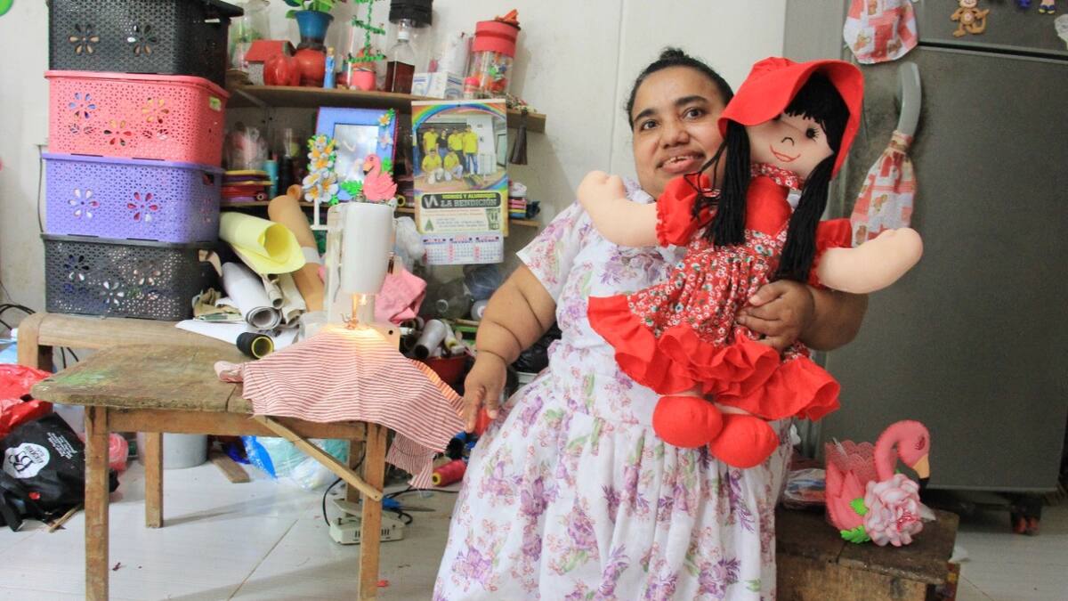 Meza Ortega, una desplazada del corregimiento Flor del Monte, en Ovejas, se le mide a poner en práctica todo lo que por iniciativa propia ha aprendido en la vida con solo 90 centímetros de estatura.