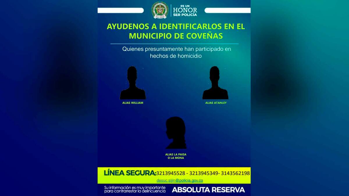 Quienes tengan información de la identidad y paradero de ‘William’, ‘Atanley’ y ‘la Paisa’ o ‘la Mona’ pueden informar a través de las líneas seguras 3213945528, 3213945349 y 3143562198 y el correo desuc.sijin@policia.gov.co.