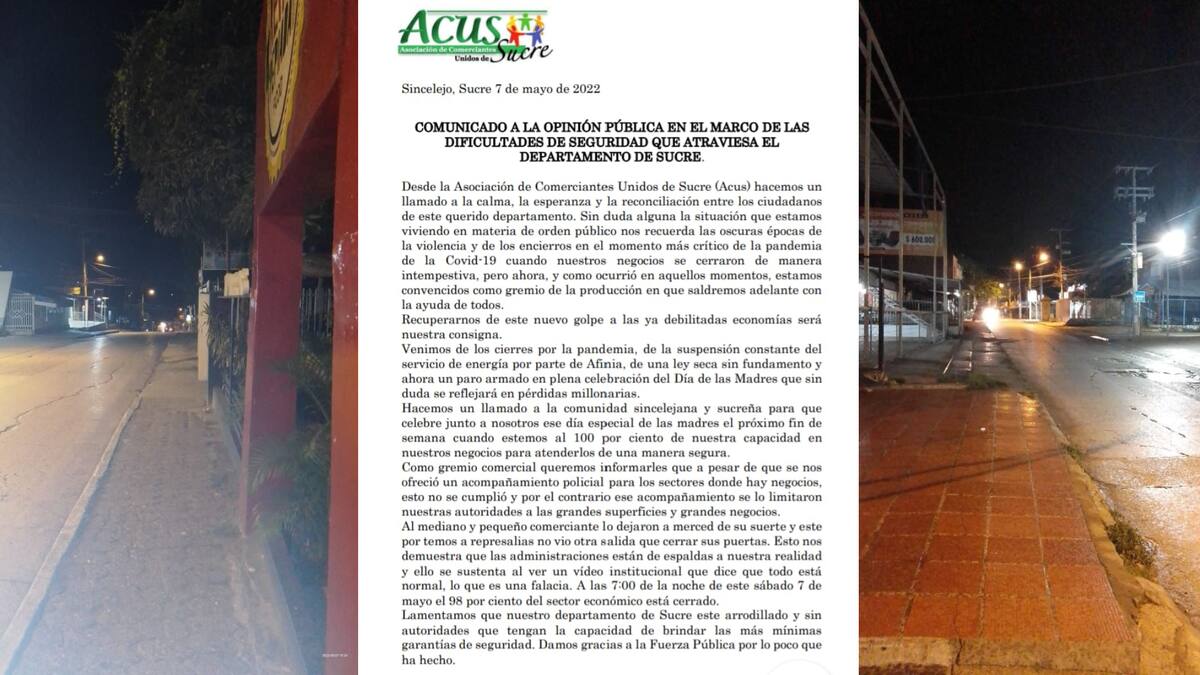 'Sin duda alguna la situación que estamos viviendo en materia de orden público nos recuerda las oscuras épocas de la violencia y de los encierros en el momento más crítico de la pandemia de la Covid-19 cuando nuestros negocios se cerraron de manera intempestiva, pero ahora, y como ocurrió en aquellos momentos, estamos convencidos como gremio de la producción en que saldremos adelante con la ayuda de todos. Lamentamos que nuestro departamento de Sucre esté arrodillado y sin autoridades que tengan la capacidad de brindar las más mínimas garantías de seguridad. Damos gracias a la Fuerza Pública por lo poco que ha hecho', puntualiza Acus que está a la espera que el gobernador Héctor Olimpo Espinosa Oliver los escuche en una reunión.