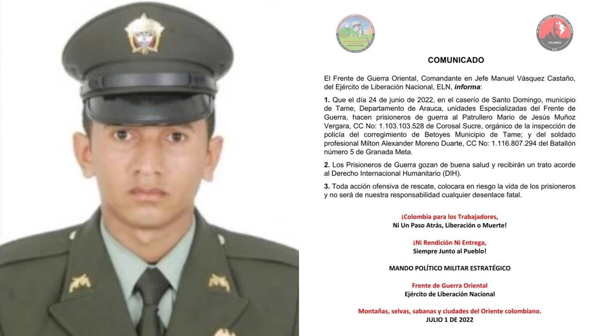 En el comunicado de este lunes 4 de julio el ELN no solo se atribuye el secuestro de Mauro de Jesús, sino también el de soldado profesional Milton Alexánder Moreno Duarte, del Batallón 5 de Granada, Meta.
