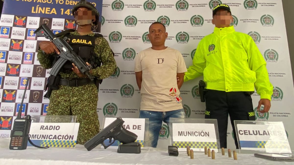 Para la captura de este también contaron con el apoyo del Gaula Militar de Bolívar y le hallaron en su poder una pistola Glock calibre 40, cartuchos, proveedor, radio de comunicaciones y dos teléfonos celulares. Todo ello quedó a órdenes de la Fiscalía.