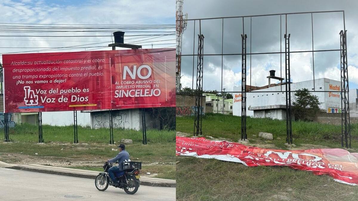 La valla de 8 metros de ancho por 4 de alto tenía un contenido que se refería al no cobro abusivo del impuesto predial en Sincelejo indicando que 'la actualización catastral y el cobro desproporcionado del impuesto predial es una trampa expropiatoria contra el pueblo'.