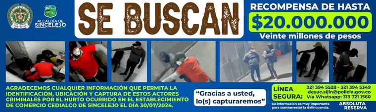 La Alcaldía de Sincelejo intensificó desde este sábado 3 de Agosto la campaña de ofrecimiento de recompensa por la información que permita ubicar y capturar a los asaltantes de una bodega de refrescos en esta ciudad.