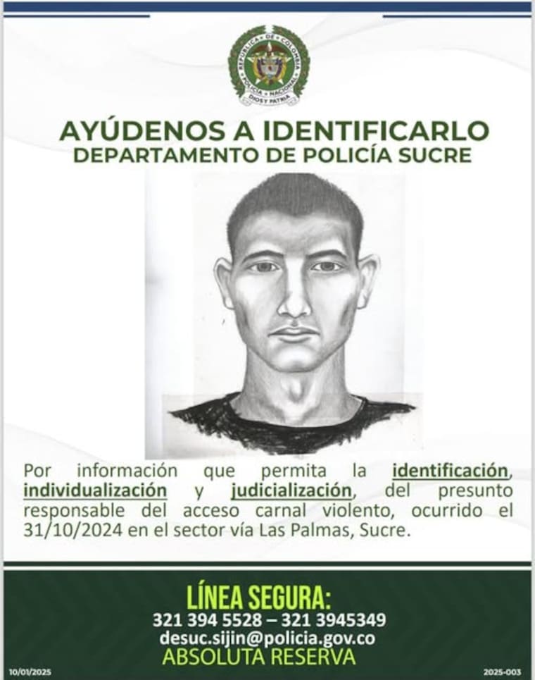Con el retrato hablado las autoridades administrativas y de Policía de Sincelejo le piden a la ciudadanía que ayude a identificarlo y capturarlo, pues estaría acosando sexualmente a las mujeres, y en especial le atribuyen un caso de acceso carnal violento ocurrido el 31 de octubre del año 2024 en la vía Las Palmas.