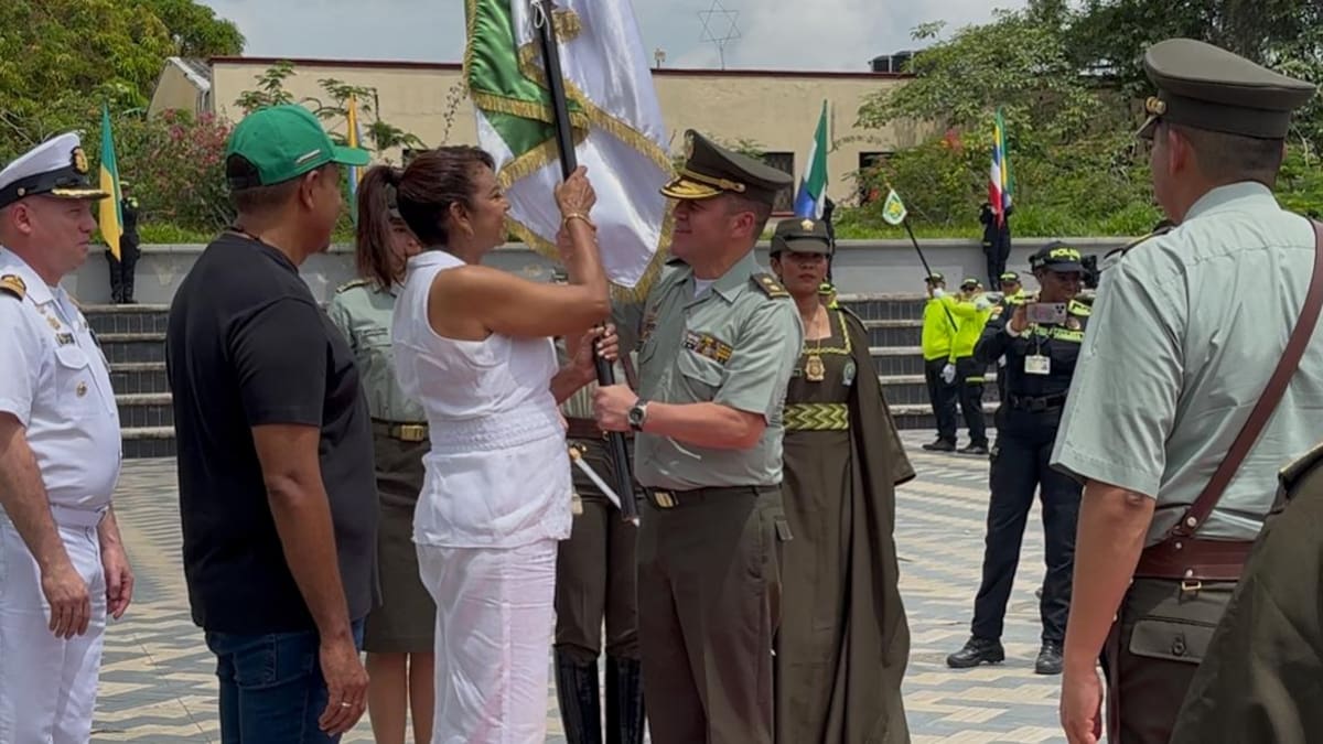 Por su parte la gobernadora de Sucre, Lucy García Montes, fue la encargada de entregarle al Comandante de la Policía de Sucre la bandera del departamento que simboliza la gran responsabilidad que tiene el oficial con garantizar la seguridad de todos en este territorio.