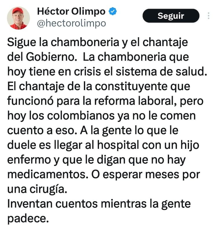 El primero en referirse en redes sociales a la problemática fue el exgobernador Espinosa Oliver diciendo: “Sigue la chambonería y el chantaje del Gobierno. La chambonería que hoy tiene en crisis el sistema de salud. El chantaje de la constituyente que funcionó para la reforma laboral, pero hoy los colombianos ya no le comen cuento a eso. A la gente lo que le duele es llegar al hospital con un hijo enfermo que le digan que no hay medicamentos. O esperar por una cirugía. Levantan cuentos mientras la gente padece”.