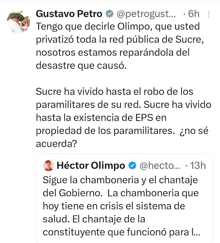 Ante esto, la respuesta del presidente Gustavo Petro no se hizo esperar y, en la misma red social, le respondió al ahora precandidato diciendo: “Tengo que decirle Olimpo, que usted privatizó toda la red pública de Sucre, nosotros estamos reparándola del desastre que causó”.