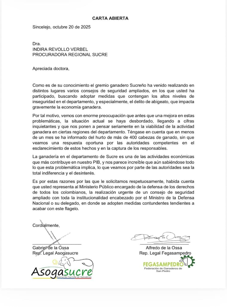 A través de una carta abierta, este gremio de la producción le hace saber a las autoridades en Sucre, entre ellas a la procuradora Regional, Indira Revollo Verbel, la situación que los afecta con la finalidad de que se adopten medidas efectivas que le hagan frente a la inseguridad.