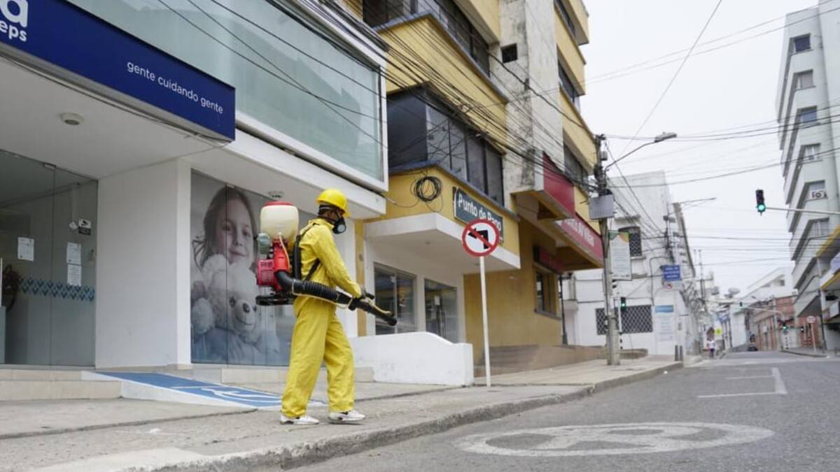 Continuando con las acciones preventivas al contagio del COVID-19 la Secretaría de Salud de Sincelejo realiza lavado y desinfección de sitios de alta afluencia, en especial en la zona céntrica donde se completan dos semanas de pago de subsidios de Familias en Acción en medio de la cuarentena obligatoria.