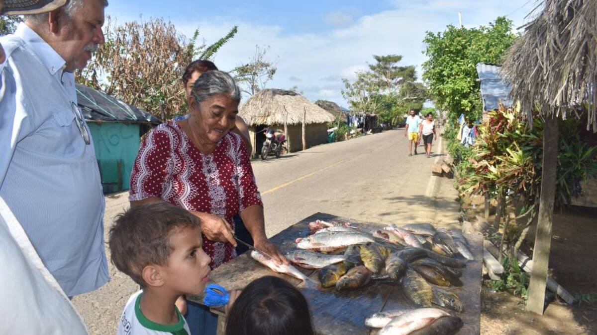 A simple vista cualquiera podría pensar que está cansada, que debería estar sentada, pero no, ella sigue en pie en medio de las fuertes temperaturas y bajo la canícula que cala hasta los huesos. Ella está refugiada en el único sitio que quedó secó 70 kilómetros a la redonda: la carretera de acceso a esa región. Ahí, sobre el ardiente asfalto de la vía, instaló su puesto de venta de pescado que sacan sus hijos de los cuerpos de agua circundantes.