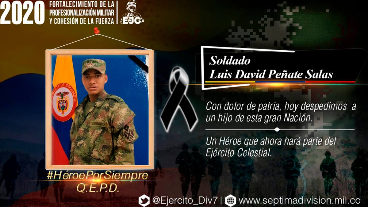'Cuando realizaban estas labores fueron atacados con armas de fuego y lamentablemente fue asesinado nuestro soldado Luis David Peñate Salas, de 19 años, oriundo de Colosó, Sucre, quien protegía a las comunidades que habitan en esta región'.