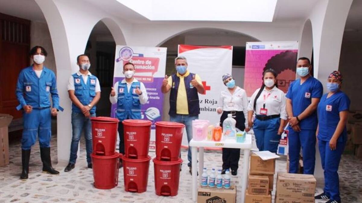 Entre las primeras aportantes está la Cruz Roja Colombiana que le entregó a la Oficina de Gestión del Riesgo del Departamento una donación que contiene cloro, gel, jabón en barra, crema humectante, jabón líquido, rollos de tela plástica, caretas, canecas plásticas, toallas humectantes, letrinas sanitarias y baño líquido.