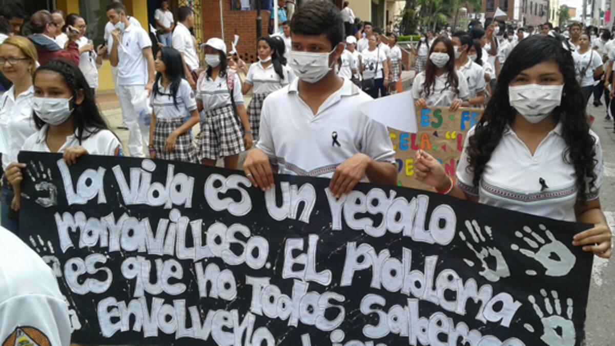 Con tapabocas, pancartas y banderines blancos, los estudiantes, docentes, directivos docentes y familiares de las víctimas de atracos, entre ellos del celador Luis Miguel Castellano Lozano, se unieron a la Marcha del Silencio.