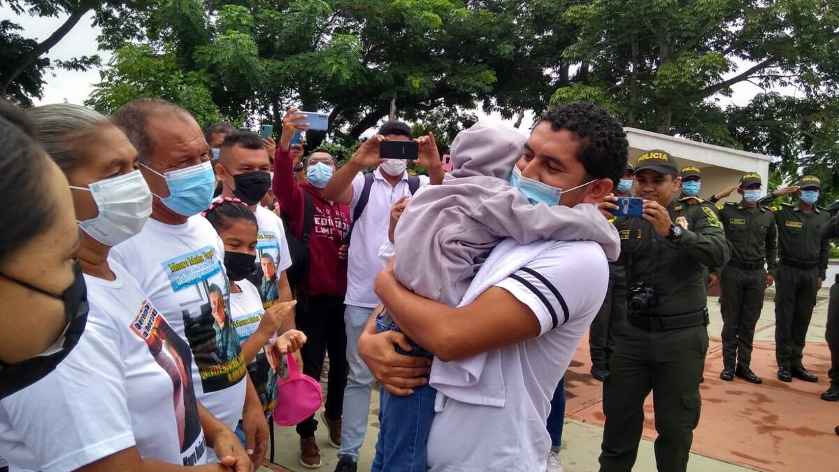 Fue el momento en el que Mauro por primera vez se reencontró con sus padres, hijos y demás seres queridos que lo esperaron con un abrazo y con camisetas de color blanco que tienen estampada la imagen del joven en su pecho.