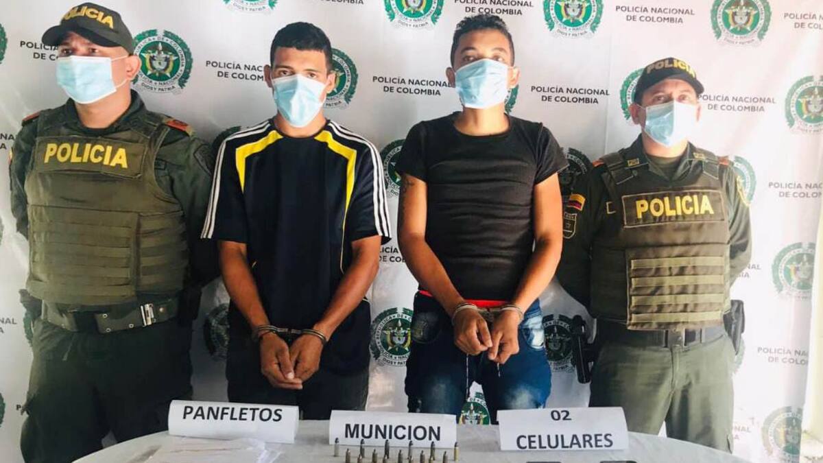 Los detenidos, que responderán ante las autoridades por los delitos de terrorismo y fabricación, tráfico, porte y tenencia de municiones, son Juan Diego Banquez Vásquez y Osman Macareno Martínez, ambos de 21 años.