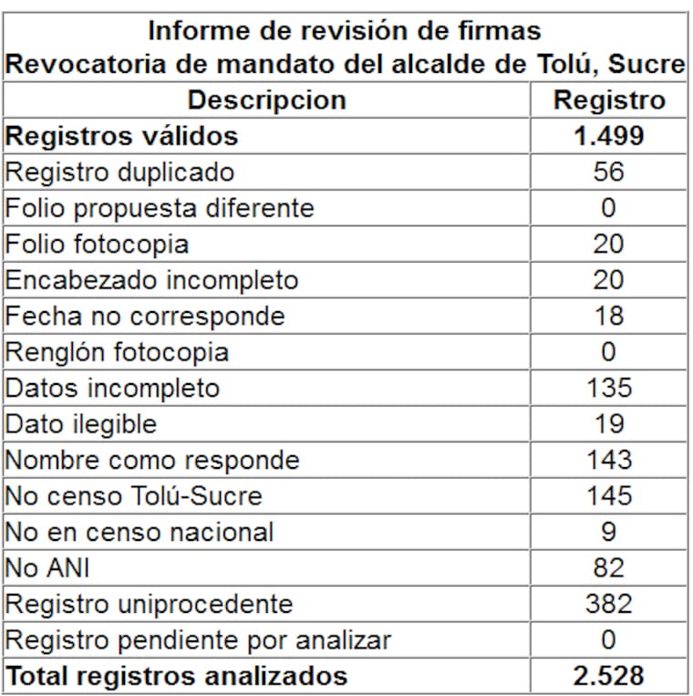 El recurso de apelación fue resuelto mediante la Resolución 003 del 8 de enero 2014, en el que la Registraduría confirma el resultado de la revisión de firmas que arrojó, que de los 2.528 apoyos aportados, 1.499 resultaron válidos, no superando el mínimo requerido de 1.994, los 1.029 apoyos restantes fueron anulados por las siguientes causas: