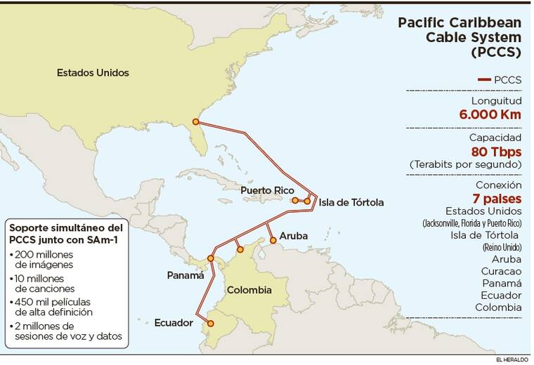 Los 6.000 km del cable de fibra óptica del PCCS comienzan en las costas de Jacksonville, Florida, y siguen por el mar Caribe a la Isla de Tórtola, Puerto Rico, Aruba, Colombia y termina en el Pacífico, pasando por Panamá hasta llegar a Mantra, Ecuador.