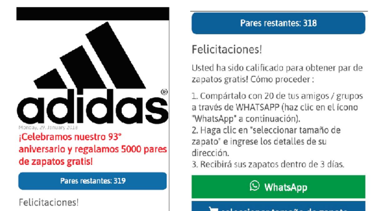 El día lunes el Centro Cibernético de la Policía Nacional dio a conocer que el mensaje difundido vía WhatsApp donde dice que 'Adidas se encuentra regalando 5.000 pares de zapatos por la celebración de su aniversario 93', es totalmente falso.