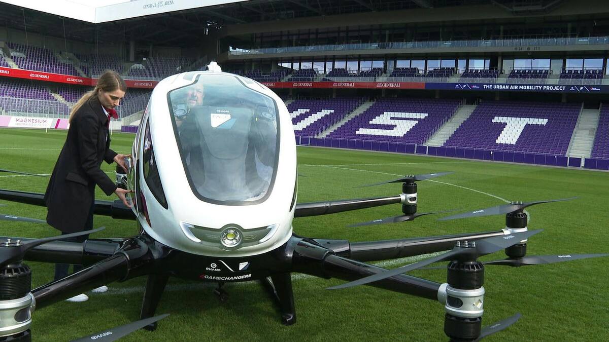 Varias grandes empresas como Boeing y Airbus están trabajando en sus propias versiones de la tecnología, pero fue la firma china EHang la que desveló su aparato en el estadio de la capital austríaca Generali Arena.