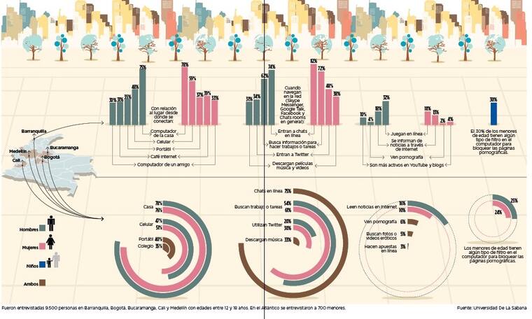 Un estudio realizado por la Universidad De La Sabana en el último trimestre de 2014 revela que en Barranquilla, Bogotá, Bucaramanga, Cali y Medellín, el 75% de los menores entran a las plataformas de comunicación e interacción (Skype Messenger, Google Talk, Facebook y chats rooms en general). A estos hay que agregarles otras redes sociales que vienen cobrando fuerza y tienen sus propios canales de conversación, como: Instagram, Ask.fm, 9gag, Snapchat y Tinder, entre otras.