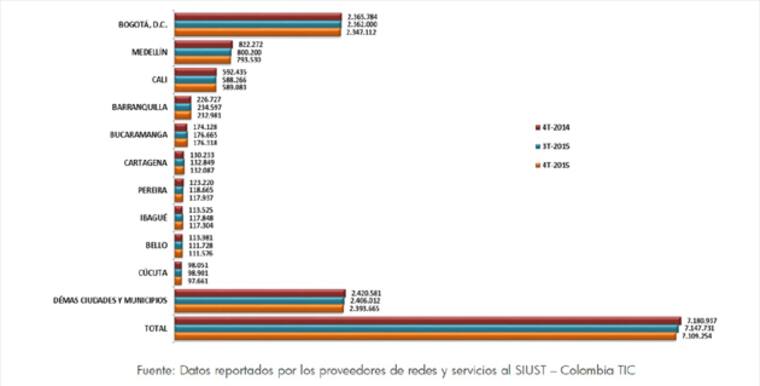 Al término del cuarto trimestre de 2015, las cinco ciudades capitales de departamento que presentan el mayor número de líneas en servicio de TPBC son: Bogotá D.C. con 2.347.112, seguida por Medellín (Antioquia) con 793.530; Cali (Valle del Cauca) con 589.083; Barranquilla (Atlántico) con 232.981; y Bucaramanga con 176.318.