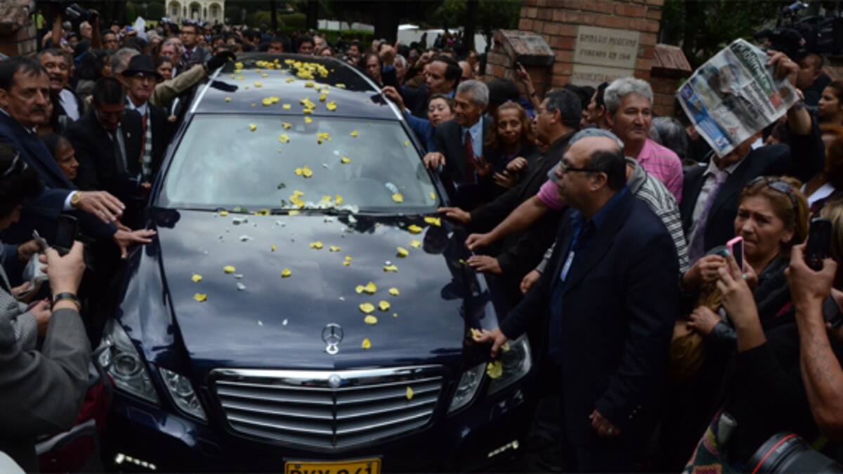 Familiares, colegas como Jorge Barón (izq.), Humberto Dorado, Diego León Hoyos, Carlos ‘el Gordo’ Benjumea; personajes de la política como el expresidente Ernesto Samper (der.) y una multitud de seguidores asistieron a la eucaristía que se celebró en el centro educativo para despedir al carismático Pacheco en medio de aplausos y una lluvia de flores amarillas que adornaron la carroza fúnebre.