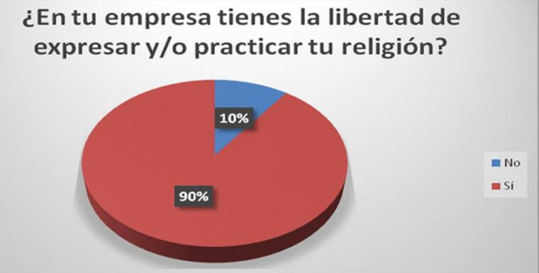 A las personas que practican alguna religión, la encuesta preguntó si cuentan con la libertad de culto en su trabajo, ante tal pregunta, el 90 % afirmó poder expresar y/o practicar su creencia religiosa, mientras solo un 10 % respondió no poder ejercer este derecho.