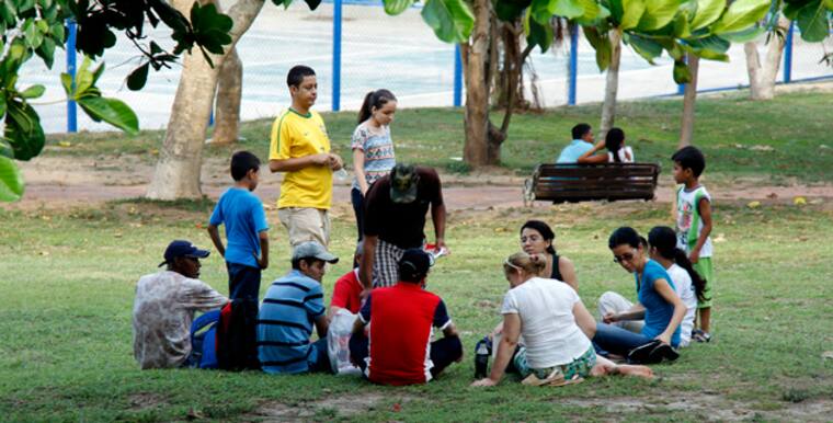 En el parque Sagrado Corazón, conocido como el Santo cachón y ubicado en el barrio Ciudad Jardín, 13 miembros de una familia están reunidos para hacer un picnic. No llevaron ni mantel, ni canasta, pero sí lo más importante: la comida. Entre ellos se reparten sánduches y un vaso de gaseosa para cada uno.