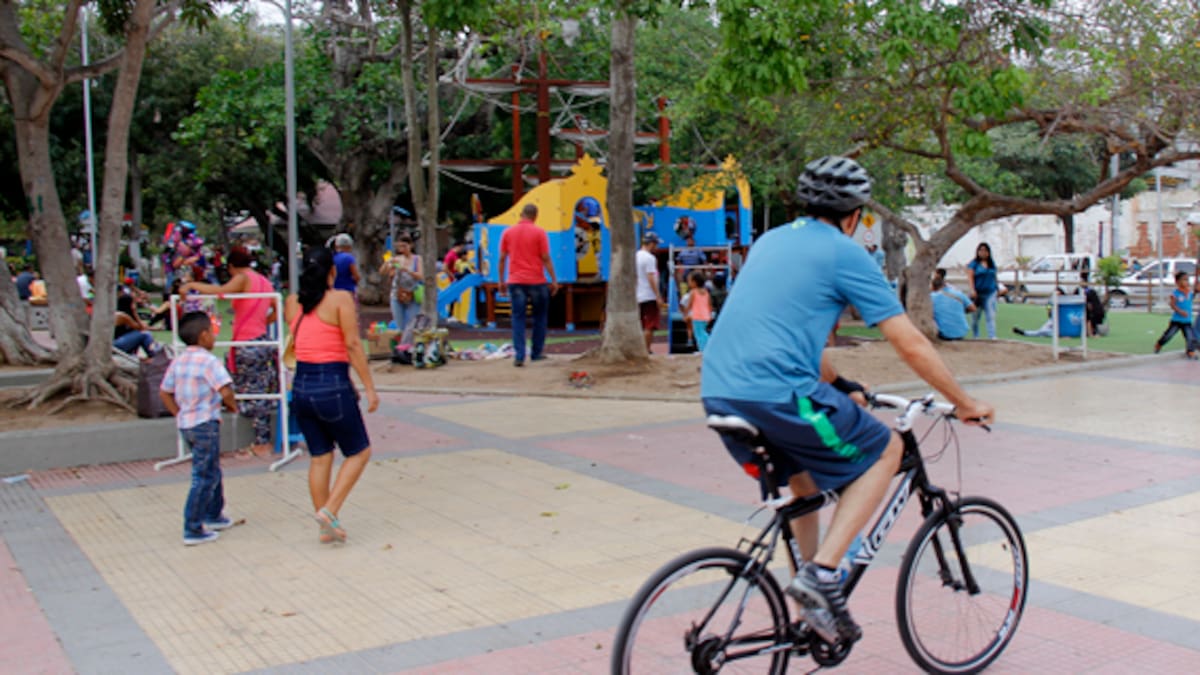 En otro punto de la ciudad, específicamente en la esquina de la calle 38 con carrera 30 del barrio San Roque, moradores del sector llenan los espacios del emblemático parque Almendra, recuperado recientemente por el Distrito.