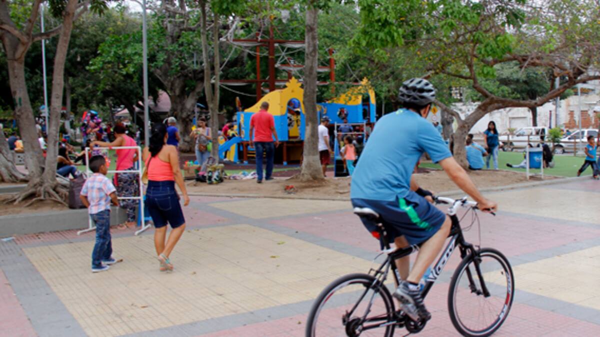 En otro punto de la ciudad, específicamente en la esquina de la calle 38 con carrera 30 del barrio San Roque, moradores del sector llenan los espacios del emblemático parque Almendra, recuperado recientemente por el Distrito.